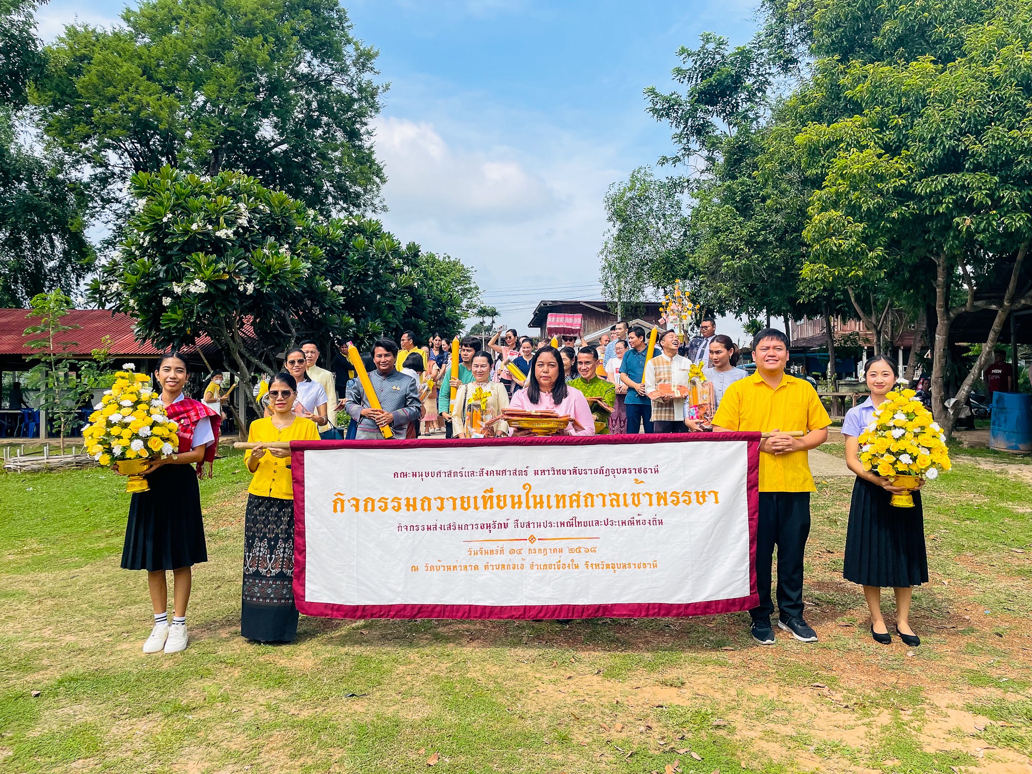 วันที่ ๑๔ กรกฎาคม ๒๕๖๘ ผู้ช่วยศาสตราจารย์ ดร.กุลวดี ละม้ายจีน คณบดีคณะมนุษยศาสตร์และสังคมศาสตร์ พร้อมด้วยผู้บริหาร คณาจารย์ บุคลากร นักศึกษาและ ผู้มีจิตศรัทธา ร่วมทำบุญถวายเทียนพรรษา ผ้าอาบน้ำฝน และเครื่องบริวาร เนื่องในเทศกาลเข้าพรรษา ประจำปี ๒๕๖๘ ณ วัดบ้านท่าลาด ตำบลก่อเอ้ อำเภอเขื่องใน จังหวัดอุบลราชธานี