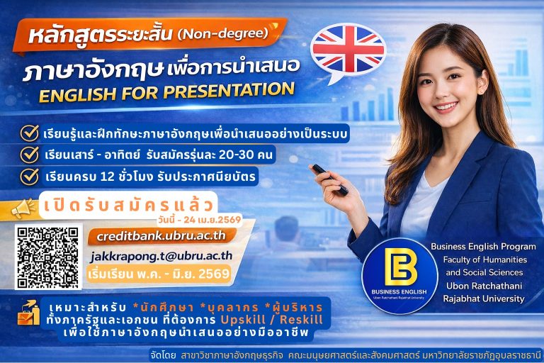 - หลักสูตรภาษาอังกฤษเพื่อการนำเสนอ (Non-Degree) มาเรียนรู้และฝึกทักษะการนำเสนอภาษาอังกฤษแบบ Practice-based